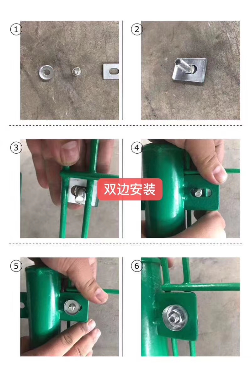 雙邊護欄網是護欄網片結構是在兩邊有兩根絲而得名。這樣的結構是為了方便護欄網片和護欄網立柱的鏈接固定。框架護欄網是在邊框上面有鏈接部件的。從結構上面就能看出兩者的不同。在防盜螺絲上面也是不同的。先說雙邊護欄網防盜螺絲是由四部分組成(螺絲桿,螺絲母,防盜螺絲碗,墊片)。框架護欄網防盜螺絲是由三部分組成(螺絲桿,螺絲母,防盜螺絲碗)。雙邊護欄網只是比框架護欄網多一個墊片。墊片的作用是卡住雙邊護欄網片上面的雙邊絲而增加的。這樣就是雙邊護欄網名字的由來。